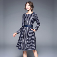 2018新款知性蓝色条纹长袖连衣裙气质修身大摆OL裙 配腰带