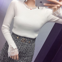 珂依舍2017秋装新款#现货秋装新款弹力针织包心纱面料拼接蕾丝打底上衣
