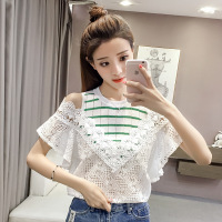 薇侣2017新款韩版镂空蕾丝衫夏季漏肩T恤宽松短袖荷叶边上衣