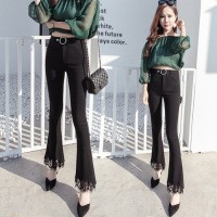 浅娜芬新款2017春夏韩版高腰蕾丝边女裤微喇叭裤九分裤显廋外穿阔腿裤黑色裤