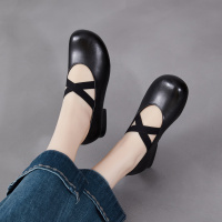 真皮圆头交叉带芭蕾舞鞋女26春款复古软底粗中跟浅口单鞋玛丽珍鞋