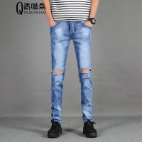 尊首新款20172017夏季新款青年膝盖破洞牛仔裤小脚裤弹力修身潮长裤水洗大码裤浅蓝色