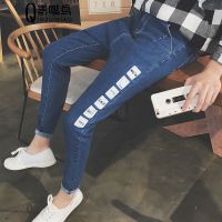 2017秋冬新品男士复古水洗小脚裤韩版字母刺绣百搭纯色修身牛仔裤