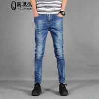 步来褶惠青年束脚牛仔裤时尚小脚裤水洗弹力抽绳修身潮流时尚修身牛仔裤男蓝色夏