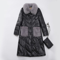 欧美A字款海宁新款绵羊皮狐狸毛领真皮羽绒服女长款外套黑色