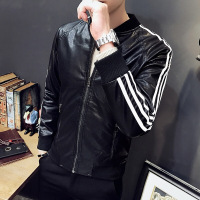 秋冬时尚立领皮衣外套男韩版潮流修身型帅气三杠PU仿皮夹克男黑色