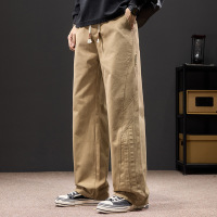 男士卡其色阔腿休闲裤 抽绳腰头设计 明线 春夏薄款 宽松垂感长裤