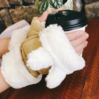 手套女冬季韩版可爱耳朵半指手套加绒加厚麂皮绒保暖学生露指打字
