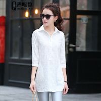 莞馨欧洲站春秋季新款女士白衬衫韩版中长款衬衣时尚刺绣中袖寸衫上衣白色