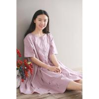 2017夏装女裙子短袖宽松纯棉纯色文艺范小清新刺绣中长款连衣裙潮