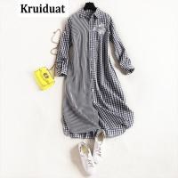 Kruidvat女装2017春季新款重工绣花小方格开衫长款衬衫连衣裙B075灰色