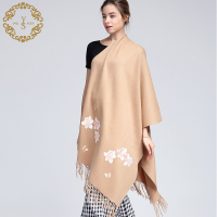 羔羊毛蝴蝶花绣花围巾秋冬季新款女士流苏羊毛披肩藏青70X190cm