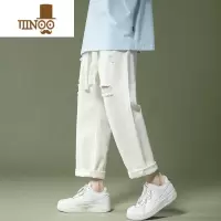 YANXU米白色破洞牛仔裤男直筒宽松古着vintage裤子高街潮ins九分工装裤
