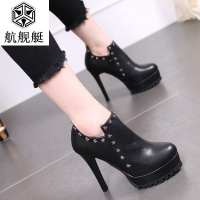 超高跟裸靴女2017新款短靴春秋单靴防水台铆钉时尚夜店细跟高跟鞋