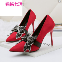 锦铭七玥韩版时尚尖头高跟鞋夜店性感细跟浅口女单鞋绒面蝴蝶结女鞋