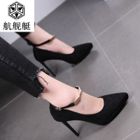 一字扣带细跟高跟鞋女秋2017新款单鞋防水台绒面浅口尖头工作鞋黑