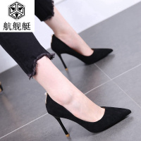 10CM细跟高跟鞋女2017新款单鞋浅口水钻绒面尖头鞋百搭黑色工作鞋