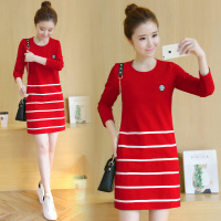 莞馨(wanxin)新款秋冬新款韩版修身条纹连衣裙女长袖加绒加厚打底衫中长款打底裙潮