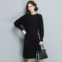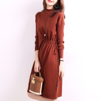 秋冬新款韩版系带纯色中长款套头连衣裙女长袖圆领羊毛衫