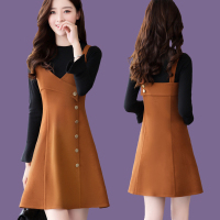 吊带连衣裙子秋冬新款女韩版两件套套装裙中长款毛呢打底背带裙潮