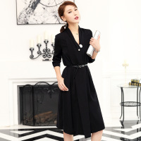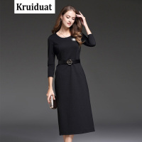 Kruidvat2017新款欧美女装收腰气质弹力圆领九分袖胸针纯色礼服连衣裙B084