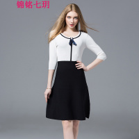 锦铭七玥2018春季新款胸针高腰拼接撞色圆领针织连衣裙女七分袖学生A字裙