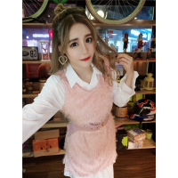 2017秋冬中长款衬衣+毛毛背心连衣裙配腰带好质量粉色均码