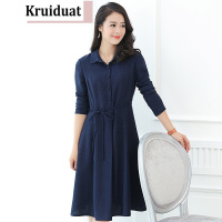 奈琴尔秋长袖翻领纽扣系带修身连衣裙藏青色