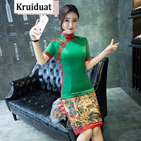 奈琴尔2017新款双层人字纹中长款旗袍连衣裙日常中袖复古修身旗袍短款1708
