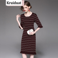 奈琴尔2017早秋新款欧美条纹修身圆领荷叶袖连衣裙棕色均码