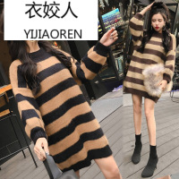 衣姣人(YIJIAOREN)女装2018春秋季新款加厚灯笼袖水貂绒毛衣女条纹针织连衣裙好质量深咖+卡其均码