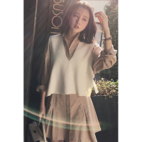 韩版收腰棉质显瘦长袖衬衫连衣裙+针织衫背心外穿马甲裙子套装