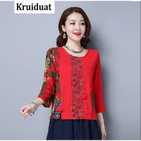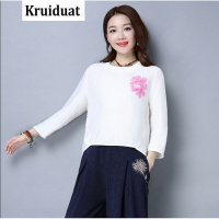Kruidvat2017春民族风棉麻长袖碎花T恤亚麻打底衫上衣B078
