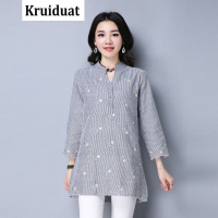 Kruidvat2017春装新款文艺条纹绣花袖口下摆花边拼接长袖棉麻上衣T恤B078