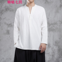 锦铭七玥秋季宽松中国风亚麻T恤男士长袖V领大码棉麻男装复古上衣薄款色