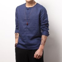 YANXU中国风T恤男长袖V领大码胖子复古上衣亚麻打底衫棉麻料衣男装
