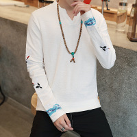 中国风男装棉麻T恤V领大码打底衫长袖春季修身复古仙鹤刺绣上衣服CYLLOW
