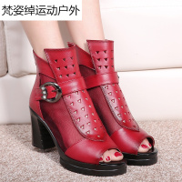 春夏新款真皮凉鞋粗跟防水台网纱凉靴欧美时尚鱼嘴鞋镂空女鞋