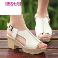 锦铭七玥断码2017夏新款真皮高跟防水台凉鞋女粗跟厚底透气舒适鱼嘴鞋