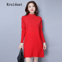 Kruidvat 奈琴尔冬季新款大码女装镶钻韩版半高领羊毛毛呢女连衣裙女中长款打底衫M6