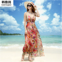 韩雅俏(HANYAQIAO)2018新品度假风桑蚕丝手工钉珠镶钻长款吊带连衣裙
