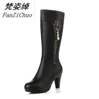 梵姿绰牛皮棉靴秋冬季女靴子粗跟真皮中筒靴高跟马丁靴女棉靴水钻棉皮靴黑色