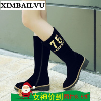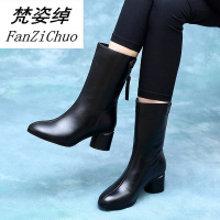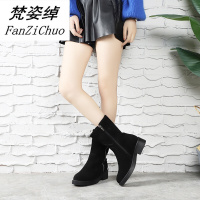 梵姿绰2017新款冬季女鞋粗跟中筒靴欧洲站圆头女靴中跟皮鞋真皮马丁靴子黑色