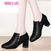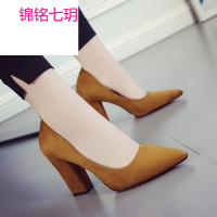锦铭七玥粗跟高跟鞋女2018春季新款黑色百搭职业浅口尖头绒面女鞋来样加工