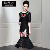 默蒂梵性感连衣裙绣花蕾丝美人鱼尾裙打底中年礼服2017春季新款女装黑色