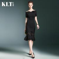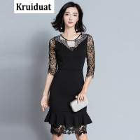 Kruidvat2017新款大码女装收腰显瘦蕾丝拼接连衣裙女鱼尾裙LSN黑色