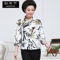 默蒂梵中老年女春装衬衣外套薄大码印花七分袖棉麻衬衫上衣中年妈妈装夏