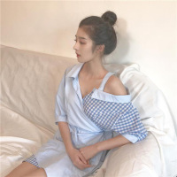 薇侣2017新品吊带拼接格子七分袖衬衫连衣裙女夏季不规则裙