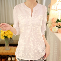 棉麻T恤女长袖2018春夏新款中长款打底衫v领亚麻衬衫宽松蕾丝上衣