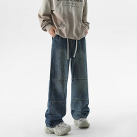 拼接拖地牛仔裤宽松直筒港风牛仔裤男基础款百搭松紧水洗青年裤子
